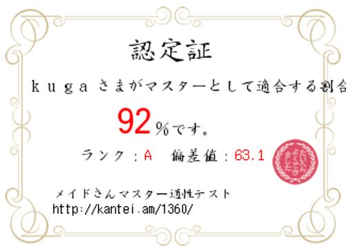 オリジナル鑑定テストが作成できるサイトで「メイドさんマスター適性テスト」を作ってみた/電脳メイドしづ子様にて 久我は92%、ちょっと規律に厳しい(歴史とか古典とかにうるさい)主人とのことでした……当たっている……というか、そもそも主人でもなんでもな…
